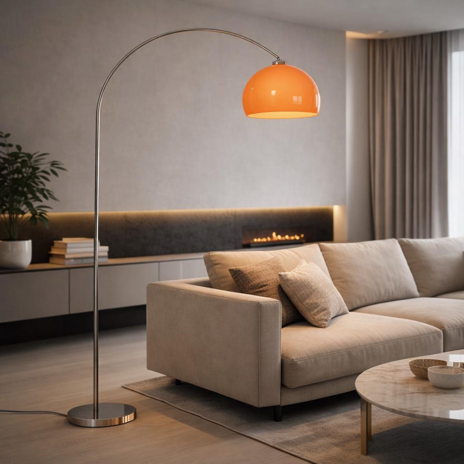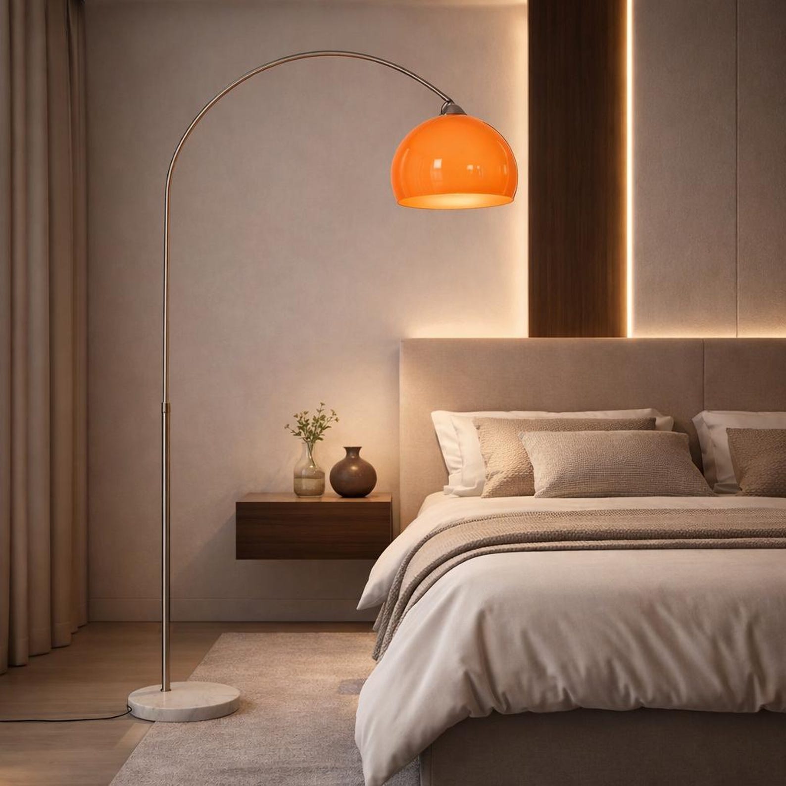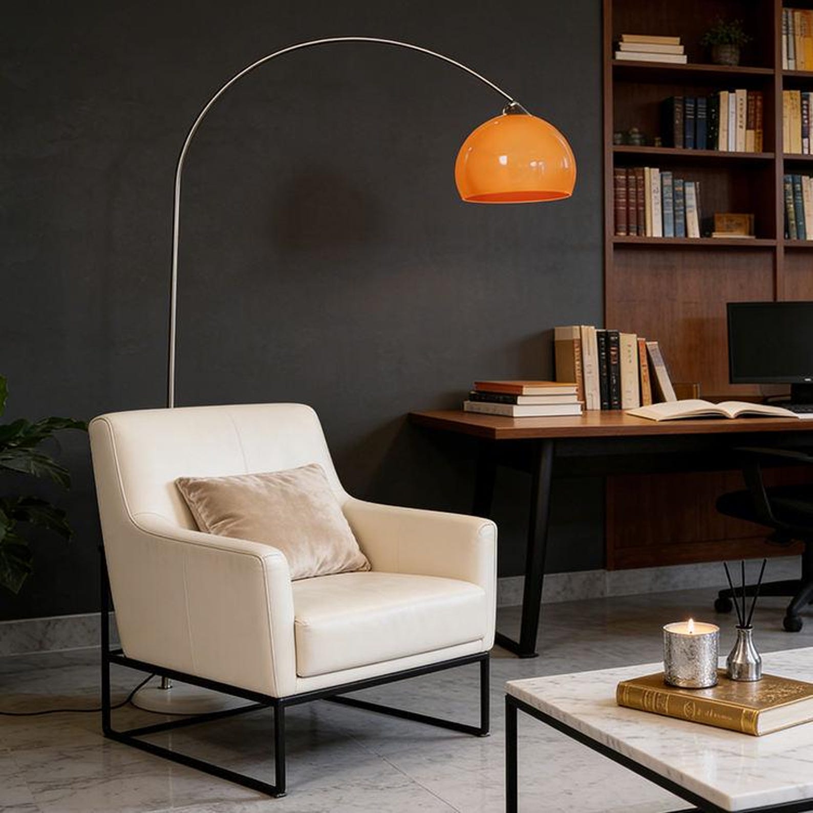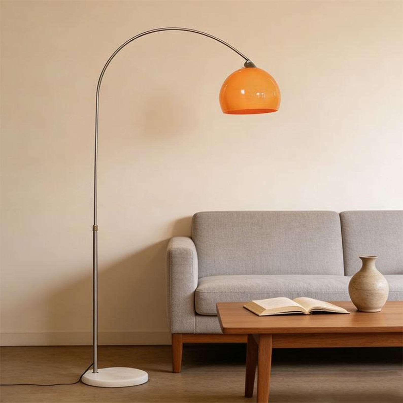 Make your interior stand out with this orange arc floor lamp, designed to blend striking style with practical everyday lighting. Its sweeping curved silhouette extends gracefully over sofas, lounge chairs, and reading corners — making it as decorative as it is functional.